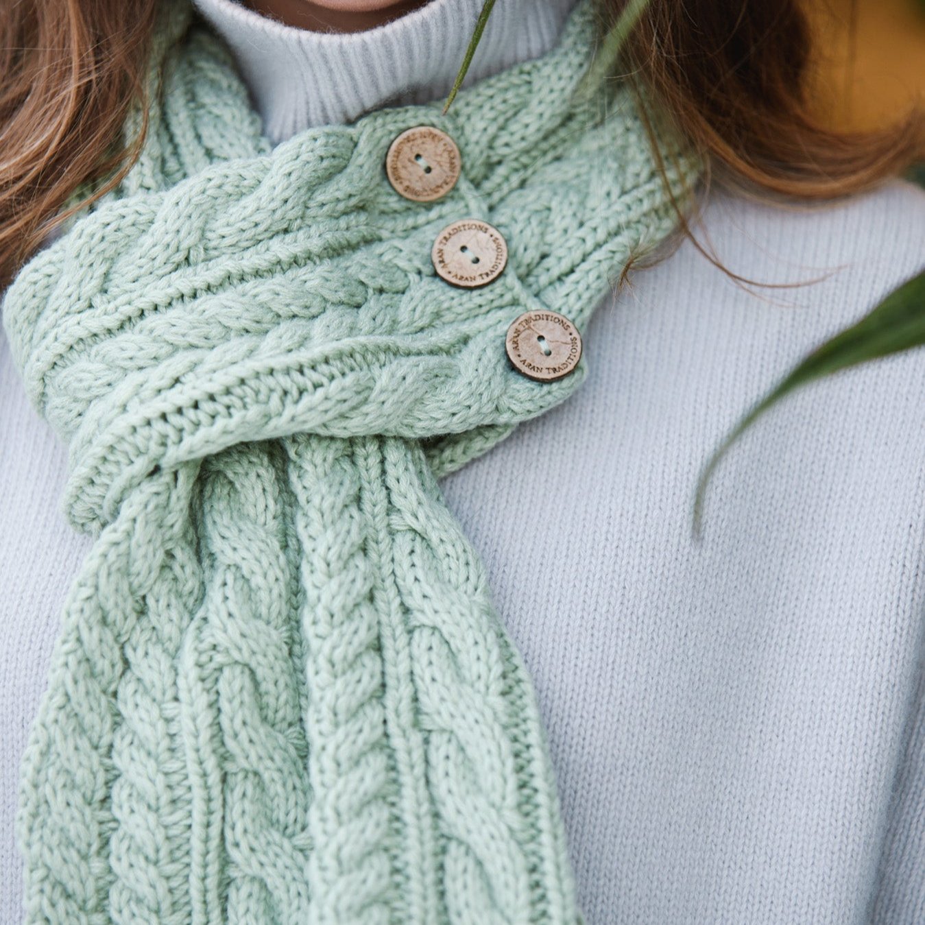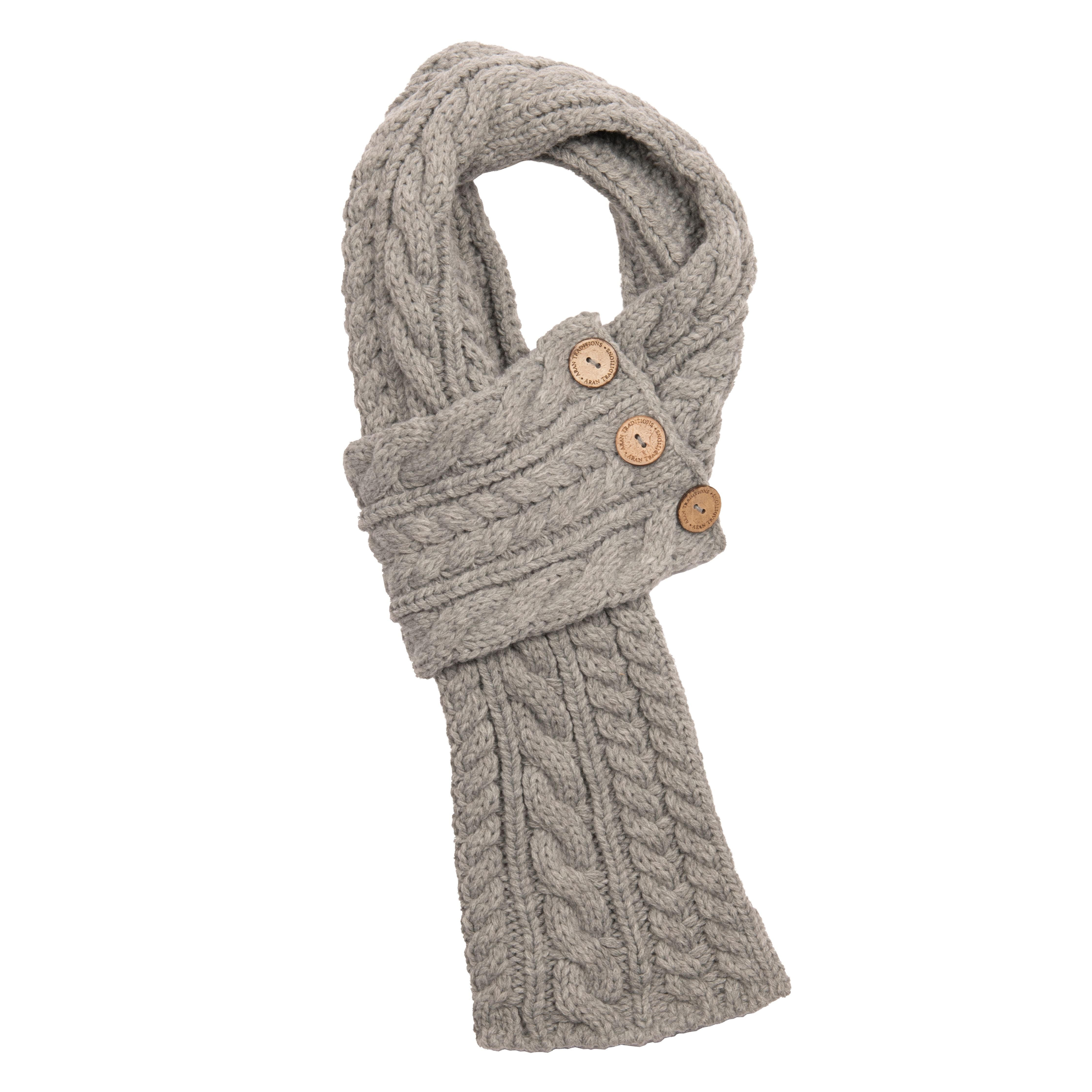 Indulge in the cozy warmth and classic beauty of the Aran Cable Button Wrap Scarf, and embrace the heritage of Aran knitting. Stay stylish and snug with this must-have accessory from Aran Traditions.