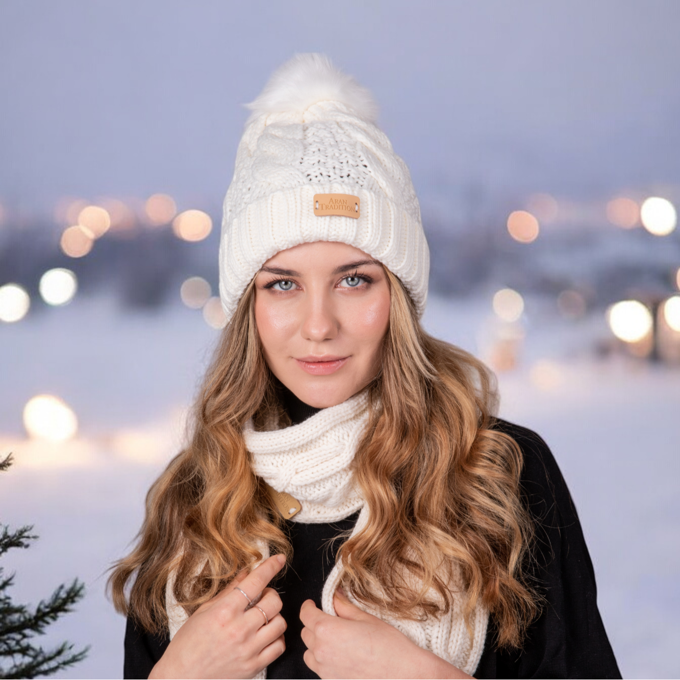 With its generous length, this versatile scarf can be styled in various ways to suit your preference. Wrap it snugly around your neck and tie the pom poms under your chin for a classic look, or let the pom poms hang loose for a more relaxed and playful style. Whether you're braving the cold outdoors or adding a cozy layer to your indoor outfit, this Aran cable pom pom scarf is a must-have accessory that combines style and functionality.
