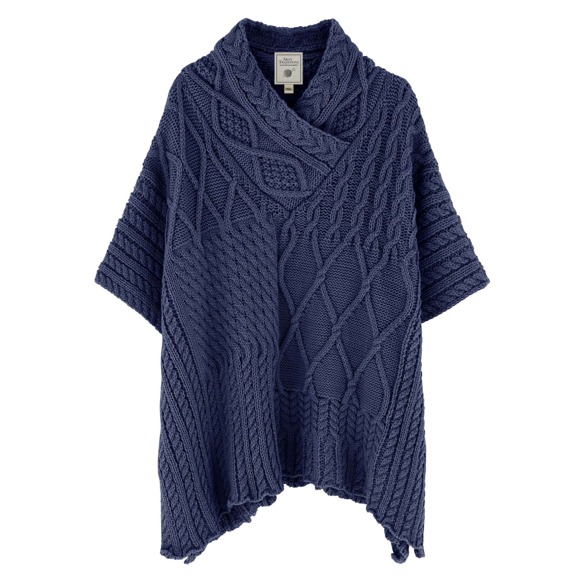 Introducing our Aran Cable Shawl Neck Cape, a must-have piece from Aran Traditions. This chunky cable knit cape showcases a traditional Aran patchwork cable design, crafted with a soft and cozy knit for ultimate comfort.