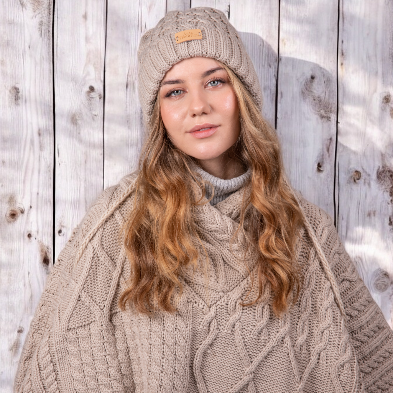 Elevate your winter style with our Aran Cable Tammy Hat from Aran Traditions. Crafted with a chunky cable knit pattern in a soft and cozy 3GG knit, this hat exudes warmth and sophistication. The natural-coloured faux fur pom pom adds a touch of elegance to the overall design.