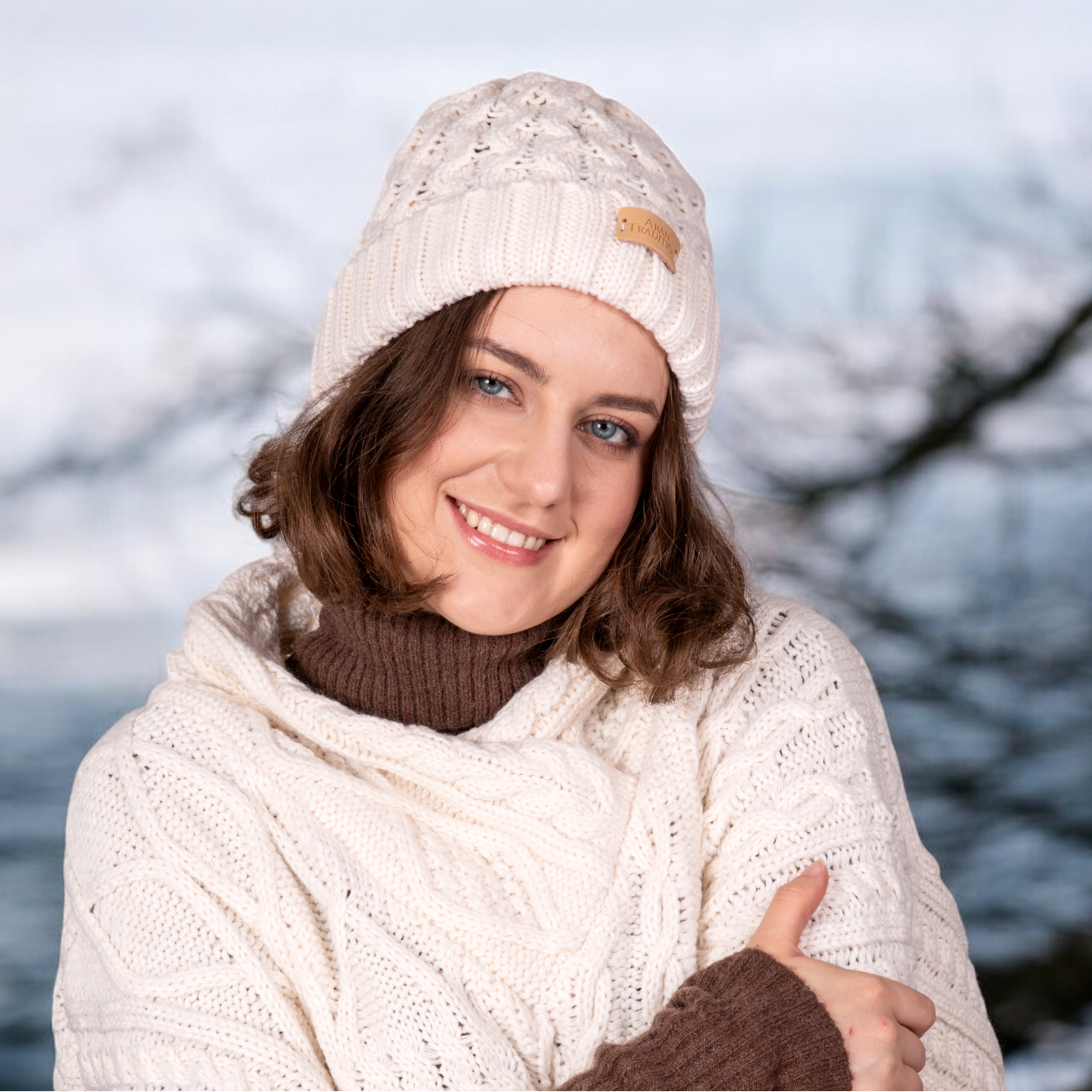 Elevate your winter style with our Aran Cable Knit Beanie Hat. Crafted by Aran Traditions, this hat features a chunky cable knit design inspired by traditional Aran patterns. The honeycomb cable design adds a touch of timeless charm to the soft and cozy 3GG knit.