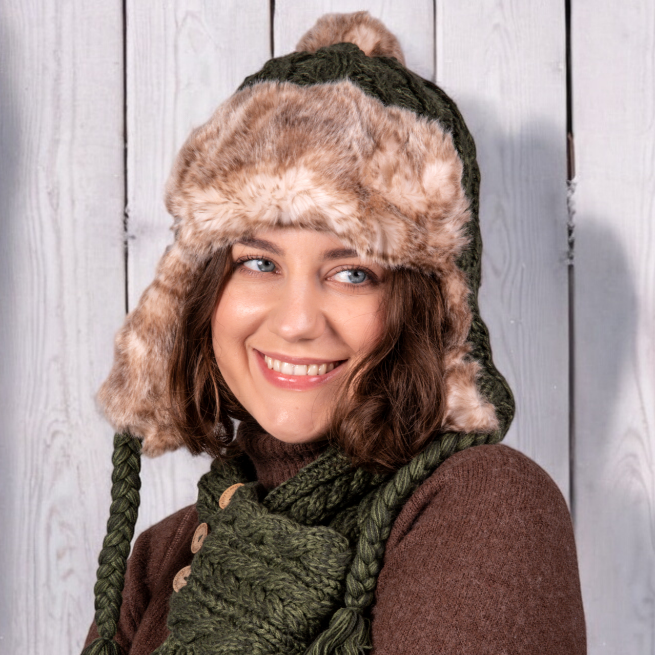 - This trapper hat features a traditional Aran cable design in a chunky knit, combining style and warmth for a fashionable winter accessory