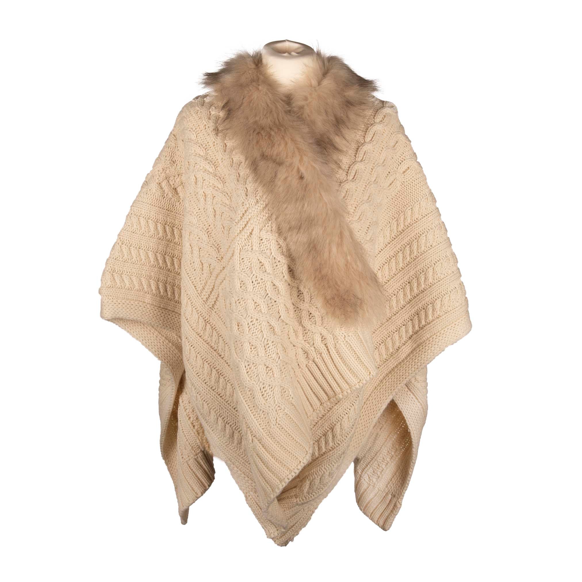 Introducing our stunning Aran Multi Cable Fur Edge Serape Shawl from Aran Traditions, a masterpiece of comfort and style. Crafted with meticulous detail, this shawl features a chunky cable knit design, inspired by the traditional Aran patchwork pattern, creating a soft and cozy feel that keeps you warm and fashionable.